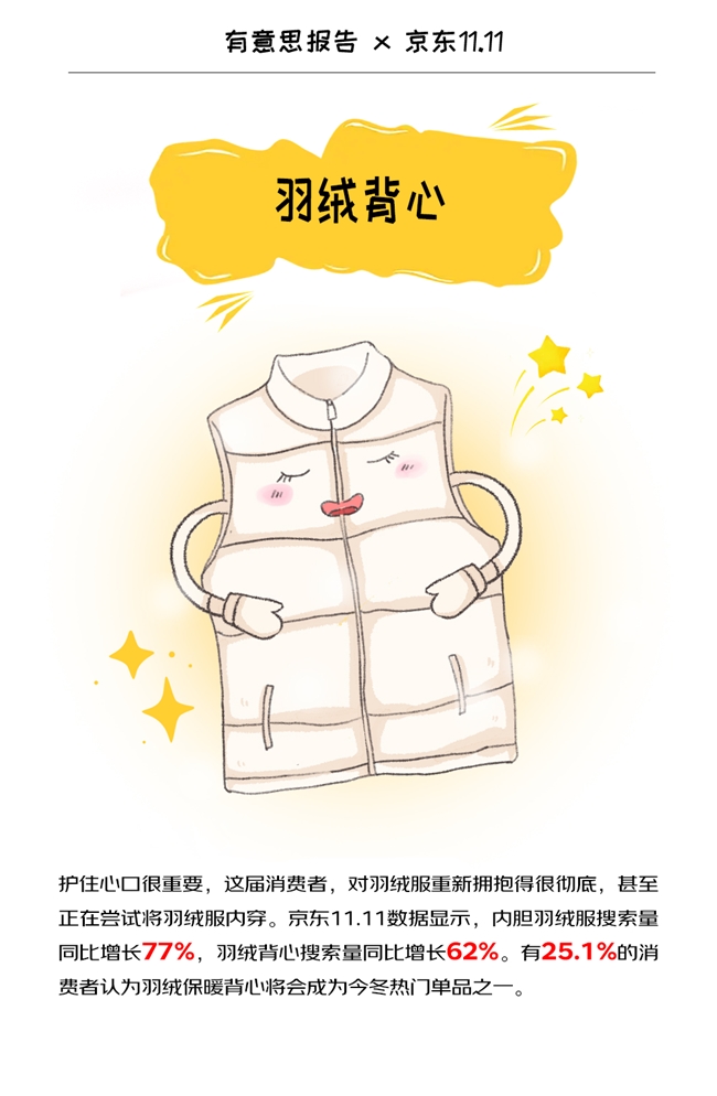 無論是都市職場風(fēng)、混搭街頭風(fēng)還是戶外休閑風(fēng),羽絨背心輕松拿捏想時尚又怕冷的問題。京東11.11期間,內(nèi)膽羽絨服搜索量同比增長77%,羽絨背心搜索量同比增長62%。有25.1%的消費(fèi)者認(rèn)為羽絨保暖背心將會成為今冬熱門單品之一。