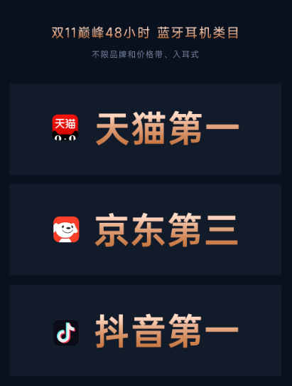 在此前為期半月的“雙十一”開(kāi)門(mén)紅周期中,訊飛AI會(huì)議耳機(jī)就一直在各大電商平臺(tái)的AI耳機(jī)榜上名列榜首,甚至在京東AI耳機(jī)TOP10榜單中幾近“屠榜”,市場(chǎng)競(jìng)爭(zhēng)力可見(jiàn)一斑。而步入“雙十一”終極沖刺的巔峰48小時(shí),其不僅在AI耳機(jī)品類(lèi)中繼續(xù)占據(jù)頂流席位,更在入耳式藍(lán)牙耳機(jī)大類(lèi)目中大放異彩:不限價(jià)格區(qū)間、無(wú)論品牌背景,訊飛AI會(huì)議耳機(jī)在天貓與抖音的入耳式藍(lán)牙耳機(jī)銷(xiāo)售榜單上均成功登頂,同時(shí)在京東也獲得了第三名的佳績(jī),展現(xiàn)了其突破細(xì)分市場(chǎng)的廣泛影響力。