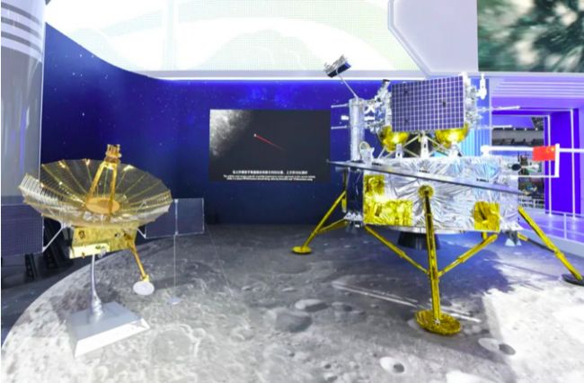 圖:嫦娥六號(hào)著陸上升組合體1-1模型和鵲橋二號(hào)中繼星1-3模型。來(lái)源:航天五院