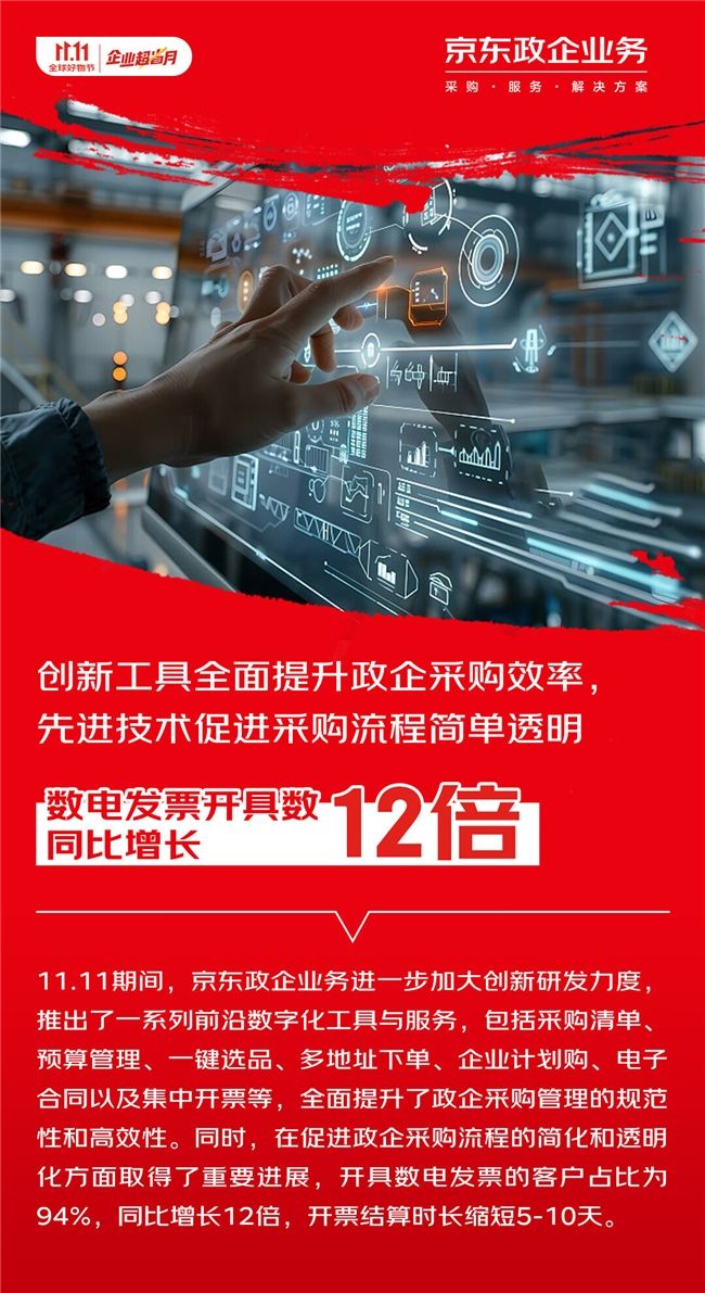 持續(xù)贏得各行業(yè)用戶信賴的背后,是京東對技術(shù)創(chuàng)新的長期投入。11.11期間,京東政企業(yè)務(wù)推出了一系列前沿數(shù)字化工具與服務(wù),包括采購清單、預(yù)算管理、一鍵選品、多地址下單、企業(yè)計劃購、電子合同以及集中開票等,全面提升了政企采購管理的規(guī)范性和高效性。同時,京東政企業(yè)務(wù)在促進(jìn)政企采購流程的簡化和透明化方面取得了重要進(jìn)展,11.11期間開具數(shù)電發(fā)票的客戶占比為94%,同比增長12倍,開票結(jié)算時長縮短5-10天。
