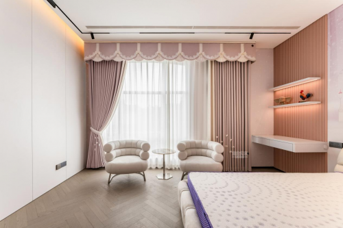 法式浪漫風(fēng):法式浪漫風(fēng)追求一種溫馨浪漫的空間氛圍感,空間整體色彩柔和,常有精美的花紋元素或法式韻味較足的古典裝飾。在窗簾顏色選擇上可以選擇馬卡龍色系的窗簾,溫柔浪漫又不失氣質(zhì)。例如如魚得水的卡布奇諾-浪漫系列窗簾,用的就是浪漫的香芋紫與奶油白配色,而且雙層窗幔上還有精致的珠繡花邊,結(jié)合珍珠雙層蝴蝶結(jié)裝飾,散發(fā)著淡淡的瑩潤光澤,法式韻味十足的同時又不會喧賓奪主,營造出一種唯美浪漫的空間氛圍。