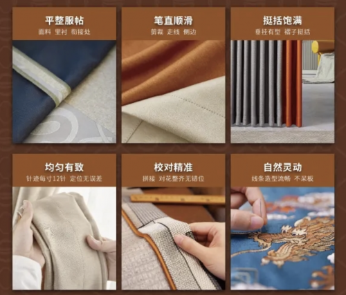 除了顏色風(fēng)格的選擇,臥室窗簾的質(zhì)感也很重要。一方面要選擇高克重高密度的窗簾,整體手感更扎實,垂感和遮光效果也更好;另一方面在走線封邊等細節(jié)上也要仔細觀察,走線整齊線頭少的更精致,質(zhì)感更好。像高端窗簾定制品牌如魚得水,窗簾選材都是高密度高克重的布料,在窗簾工藝上更是采用313道西裝工藝,縫線邊距都是精確到毫厘之間,整體精致度更高,視覺效果更好也更耐用。