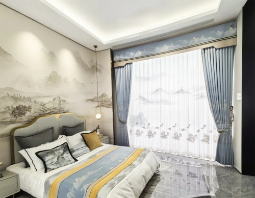 新中式風(fēng):新中式風(fēng)追求古典與現(xiàn)代的結(jié)合,強調(diào)一種寧靜治愈的氛圍感。色彩上追求素雅簡約的搭配,但同時也強調(diào)中國傳統(tǒng)文化的融入??梢詤⒖既玺~得水新中式窗簾依山傍水系列,將山水文化融入到了窗簾設(shè)計之中,在中國文化中山和水具有非常重要的象征意義。山代表穩(wěn)定和長壽,水代表財富和涼爽,亦有永恒繁榮之意。本款產(chǎn)品以灰藍色為底色,銀灰色的山巒層層疊疊,山巒中的人家依山傍水而建,悠閑自在,形成水天一色的美麗畫卷。將中式元素與現(xiàn)代材質(zhì)巧妙兼柔,營造出具有東方雅韻的詩意美。