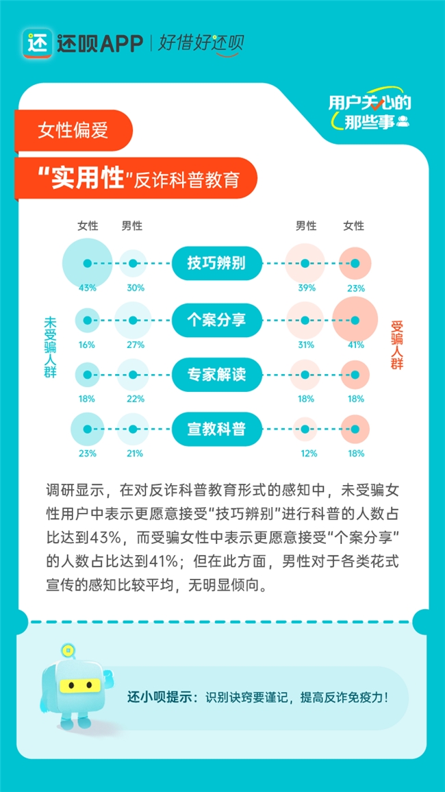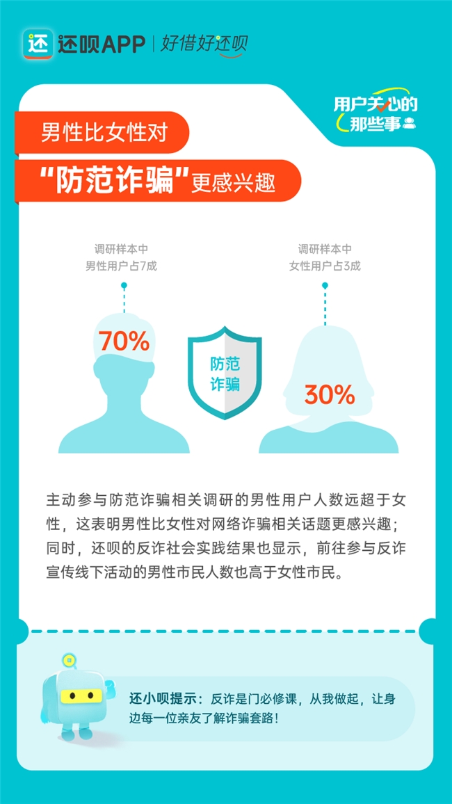 還唄App調(diào)研顯示,男性用戶對網(wǎng)絡(luò)詐騙相關(guān)話題內(nèi)容的敏感度與興趣度高于女性用戶,并在還唄實(shí)踐中發(fā)現(xiàn),前往參與還唄反詐宣傳線下活動的男性市民也比女性市民多。