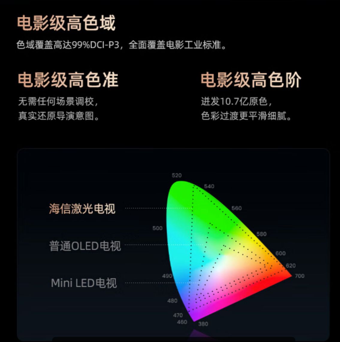 其次,上文介紹了選百吋電視所追求的就是和影院一樣的沉浸感,在這方面海信激光電視星光S1 100英寸也很有優(yōu)勢。首先,它的核心是采用了激光光源和DLP?數(shù)字放映技術(shù),這些技術(shù)與高端的激光電影院同源,能夠1:1還原影院觀感。另外,我們可以看到它公布的色域值能夠達到99%DCI-P3,這比一般高端電視95% DCI-P3的色域值要高,而色域越高,所能展現(xiàn)出來的顏色就越多,色彩就更真實,細節(jié)也更豐富。此外,對于喜歡IMAX的朋友來說也有一個好消息,就是這款海信激光電視星光S1已通過IMAX Enhanced認證,通過內(nèi)置的4K MAX影片庫和專區(qū)就能輕松享受到IMAX影院的驚艷畫質(zhì)。