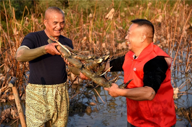 老向第一次參與挖藕,他笑著說:“第一次挖藕,感覺挺有意思的,但也確實不容易??吹竭@些新鮮的蓮藕,心里感到特別滿足?!?/p>