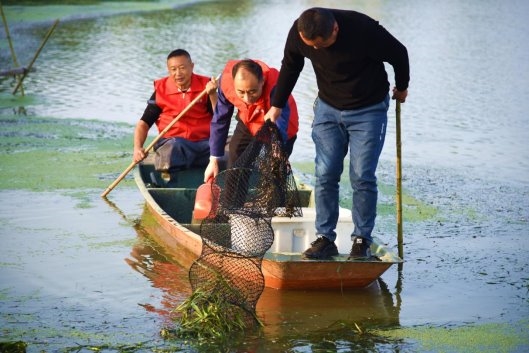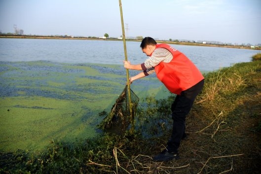 (圖為志愿者在湖中幫忙捕撈螃蟹)