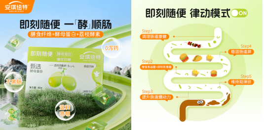 根據(jù)《2023國人“腸”煩惱及益生菌消費洞察報告》,87.6%的國人深受脹氣、便秘、消化不良、食欲不振等腸道問題困擾?;趯衲c道健康痛點的洞察,以酵母蛋白為核心成分,輔以專利原料荔枝元以及蘇州優(yōu)質荷葉、南陽決明子、云南元江庫拉索蘆薈這三味漢方草本精華,開發(fā)了即刻隨便爆漿軟糖。