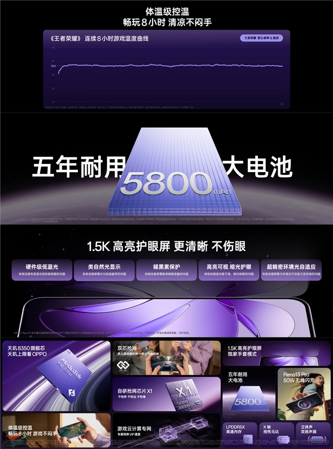 OPPO Reno13 Pro配備5800mAh五年耐用大電池,Reno13則是5600mAh五年耐用大電池,支持王者榮耀高清60幀連續(xù)游戲8小時(shí)。在日常一充的使用模式下,可實(shí)現(xiàn)五年后仍保持80%以上健康度。兩款機(jī)型均支持80W超級(jí)閃充,Pro版本還支持50W無(wú)線閃充,滿足快速充電需求。