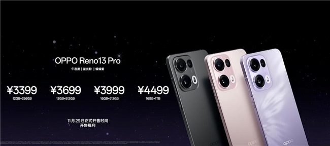 OPPO Reno13 Pro提供12GB+256GB(售價(jià)3399元)、12GB+512GB(售價(jià)3699元)、16GB+512GB(售價(jià)3999元)、16GB+1TB(售價(jià)4499元)四種存儲(chǔ)版本,有蝶蝶紫、星光粉、午夜黑三款配色可選。