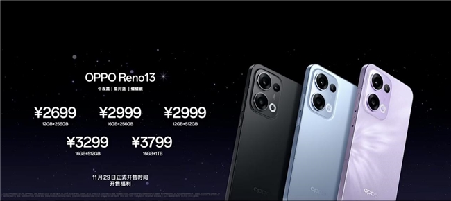 OPPO Reno13提供12GB+256GB(售價(jià)2699元)、12GB+512GB(售價(jià)2999元)、16GB+256GB(售價(jià)2999元)、16GB+512GB(售價(jià)3299元)、16GB+1TB(售價(jià)3799元)五種存儲(chǔ)版本,有蝶蝶紫、星河藍(lán)、午夜黑三種配色可選。
