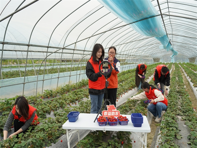 圖為志愿者正在幫助果農(nóng)采摘成熟的草莓
