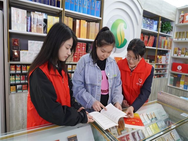 圖為“香溢”志愿者向零售戶(hù)講解黨的創(chuàng)新理論