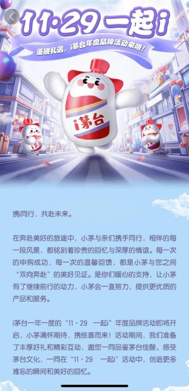 在正式上線近半年后,i茅臺于雙11這一特殊節(jié)點,官宣開啟“11·29一起i”系列活動,并特地提到了三個信息——溫暖的回饋、舒心的體驗和緊密的連接,再次印證了平臺誕生時的初心。