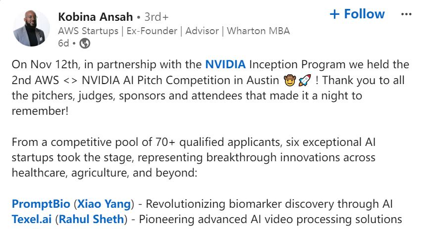 近日,由亞馬遜云服務(AWS)和英偉達(NVIDIA)聯合舉辦的AI路演大賽(AWS x NVIDIA AI Pitch Competition)在亞馬遜奧斯汀總部圓滿落幕。此次競賽旨在吸引北美地區(qū)快速發(fā)展的AI初創(chuàng)公司,為它們提供一個向人工智能行業(yè)及風險投資人展示AI前沿技術應用的平臺。大賽吸引了眾多AI創(chuàng)新玩家參加,來自加利福尼亞州普萊森頓的AI初創(chuàng)新星PromptBio在70多家參賽公司中脫穎而出,成功入圍最后6強。