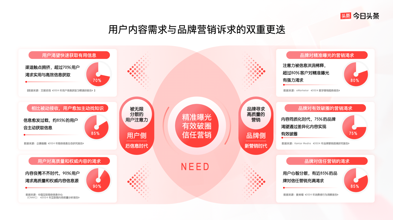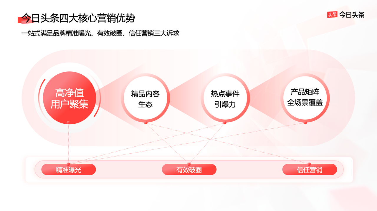 針對品牌對更高質(zhì)量營銷的需求,今日頭條基于高凈值用戶聚集、精品內(nèi)容生態(tài)、熱點事件引爆力、產(chǎn)品矩陣全場景覆蓋四大核心優(yōu)勢,給出了可靠、高效的解決方案,助力品牌實現(xiàn)精準(zhǔn)曝光、有效破圈和信任營銷,在復(fù)雜環(huán)境中收獲增長。
