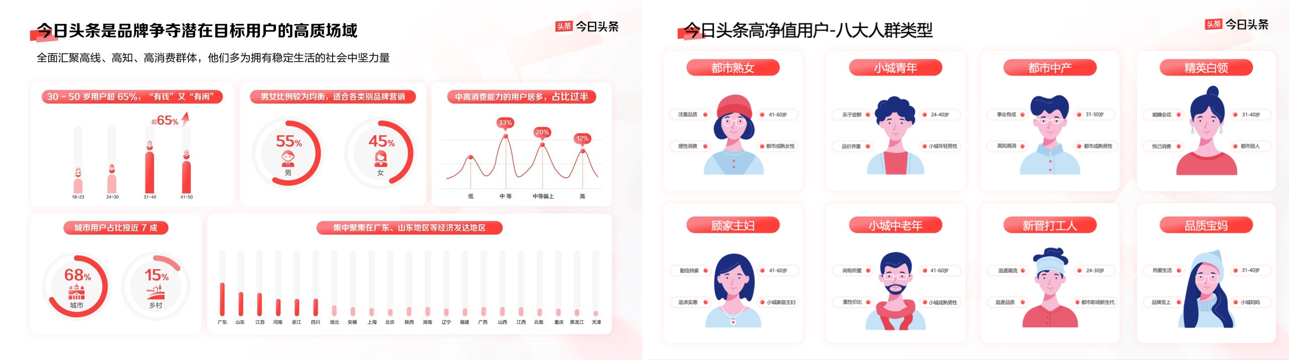 今日頭條月活躍用戶高達(dá)數(shù)億,其中30 - 50歲用戶超65%,中高消費能力占比近半,城市用戶占比接近 7 成,匯集高線、高知、高消費群體,是擁有穩(wěn)定生活的社會中堅力量,正是品牌爭奪潛在目標(biāo)用戶的高質(zhì)場域。