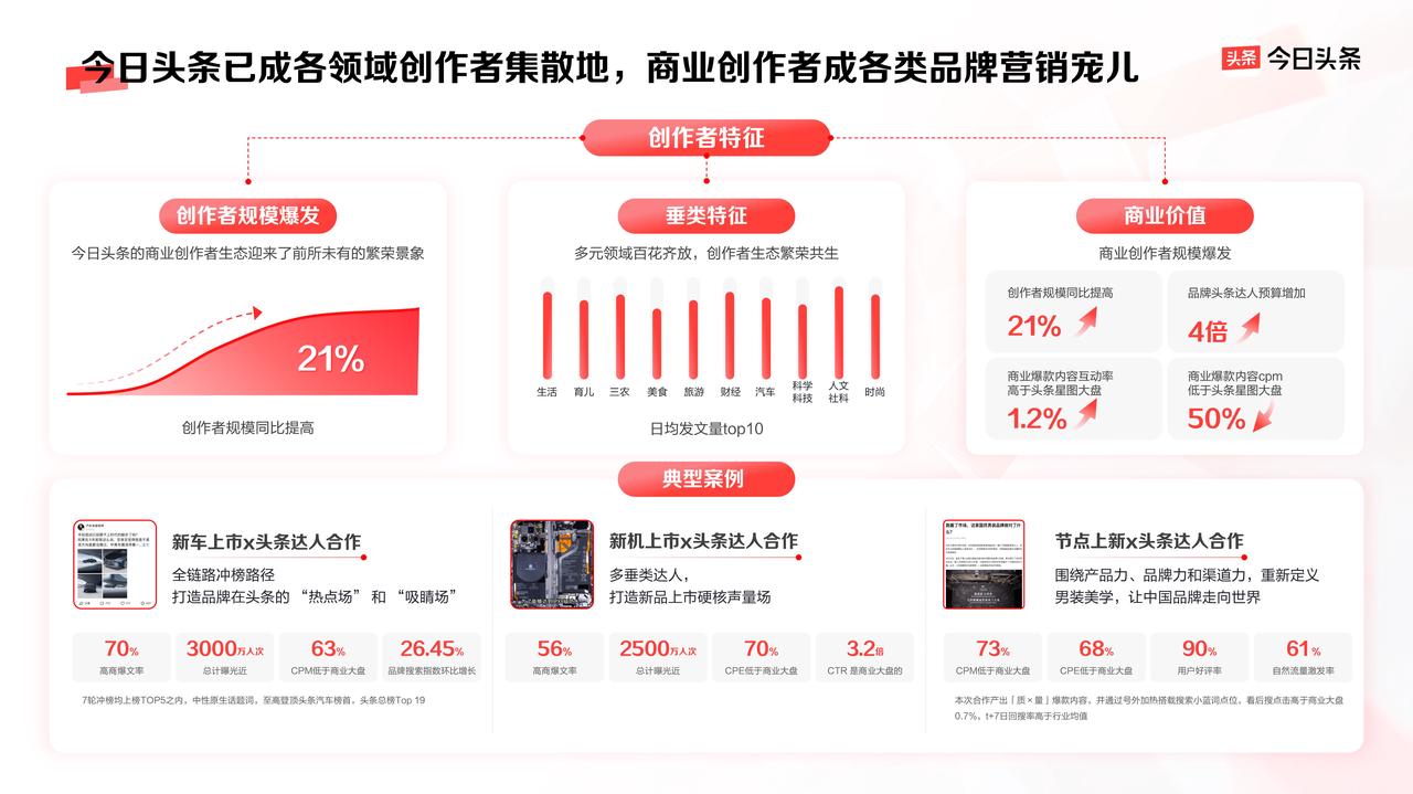 除此之外,今日頭條品牌合作覆蓋3C、家居、汽車、金融、酒類、電商等諸多行業(yè),以實例驗證平臺創(chuàng)新營銷之力,以“量身定制”的內(nèi)容、產(chǎn)品矩陣,為品牌創(chuàng)造更多營銷價值,助力品牌持續(xù)增長。