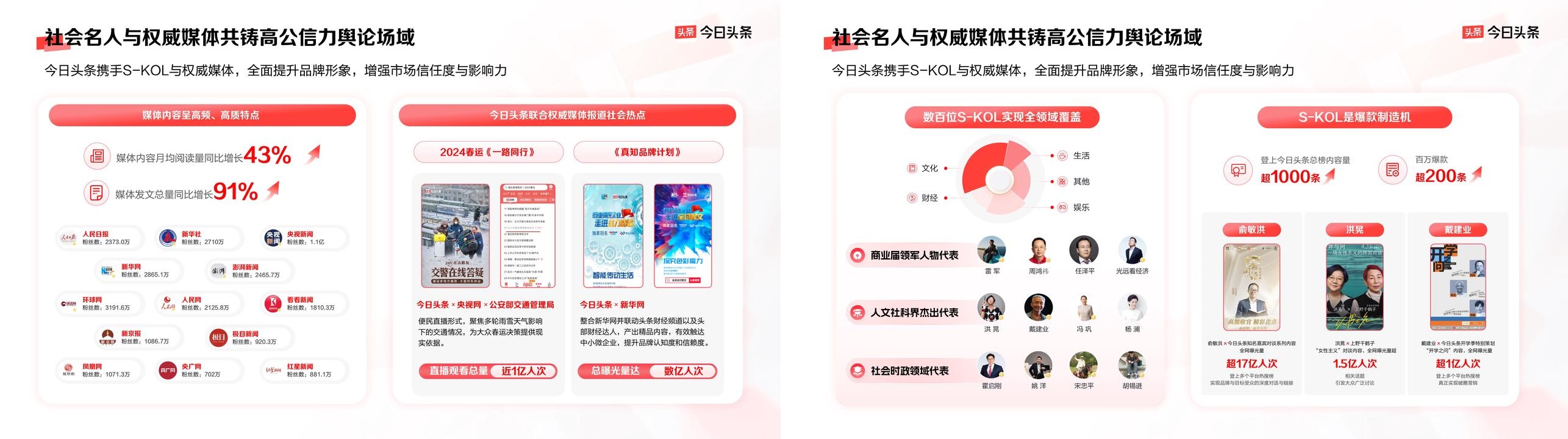 在內(nèi)容創(chuàng)作門檻降低、信息源多元化的今天,用戶更傾向于信任來自專業(yè)機(jī)構(gòu)、權(quán)威媒體或行業(yè)領(lǐng)袖的信息。今日頭條構(gòu)建的社會名人和權(quán)威媒體生態(tài),幫助品牌建立“信任坐標(biāo)”。今日頭條聚焦豐富的社會名人/明星及權(quán)威媒體,例如人民日報、新華社、央視新聞、環(huán)球網(wǎng)、新華網(wǎng)、澎湃新聞等,并開創(chuàng)了一系列優(yōu)質(zhì)節(jié)目,大幅提升用戶信任度,讓品牌的發(fā)聲更加擲地有聲。