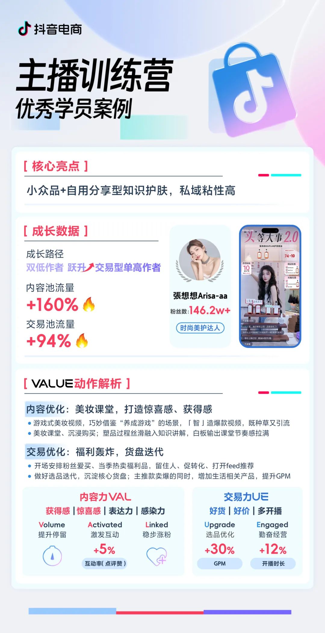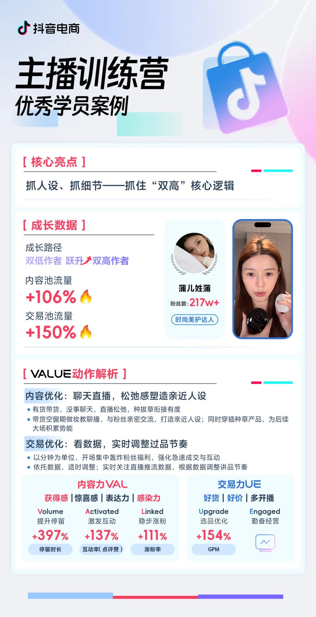 平臺機制升級后,作者們能夠在內容池和交易池同時獲得流量。這意味著在抖音電商平臺,生意增長有了更多機遇和可能性,作者們可以同時在內容力和交易力上實現新突破。兩位美妝主播@張蝦蝦 和@蒲兒姓蒲 ,結合其在主播訓練營中學習的VALUE方法論,將內容力和交易力有效配合,快速從雙低作者躍遷為雙高作者。