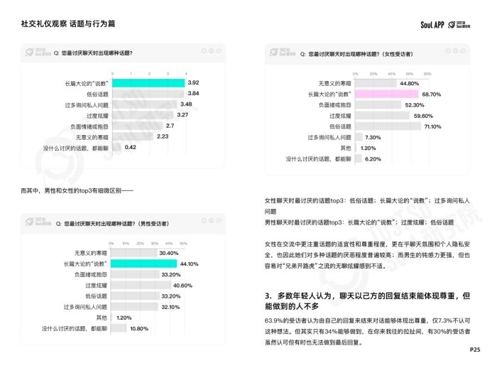 報(bào)告詳細(xì)考察年輕人在私聊過(guò)程中,涉及到“社交禮儀”的每一個(gè)環(huán)節(jié)與要素,包括長(zhǎng)語(yǔ)音、稱呼、表情、話題與行為等8個(gè)部分,生成共33條“社交禮儀觀察”——