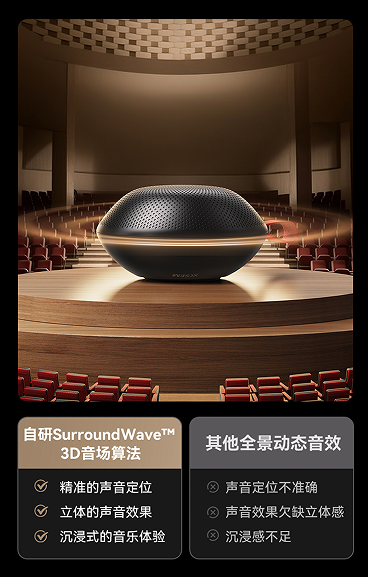除了卓越音質(zhì)之外,更在人性化智能設(shè)計(jì)方面展現(xiàn)了獨(dú)特的優(yōu)勢(shì),音響采用了自主研發(fā)的SurroundWave 3D音場(chǎng)算法技術(shù),這一技術(shù)通過對(duì)音頻各個(gè)點(diǎn)位的頻率和特性進(jìn)行深入分析,精確計(jì)算出聲音的定位、距離和角度,從而實(shí)現(xiàn)對(duì)聲源位置的精準(zhǔn)模擬。無論是觀看電影、玩游戲還是欣賞音樂,用戶都能感受到仿佛置身于音樂會(huì)現(xiàn)場(chǎng)的真實(shí)感。