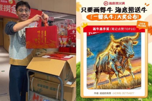 這場以“畫牛得牛”為主題的創(chuàng)意活動于2024年10月18日正式啟動,并在全國范圍內(nèi)掀起了一場繪畫熱潮?;顒映掷m(xù)了整整30天,全國范圍內(nèi)1310家海底撈門店共同參與,同時在線上通過小紅書平臺發(fā)起投稿征集。低門檻的參與形式與誘人的大獎吸引了大批藝術(shù)愛好者與普通消費者的關(guān)注,活動期間累計收到近40萬幅投稿作品,線上話題#海底撈畫牛的瀏覽量更是突破4408.9萬,成為當(dāng)之無愧的社交熱點。