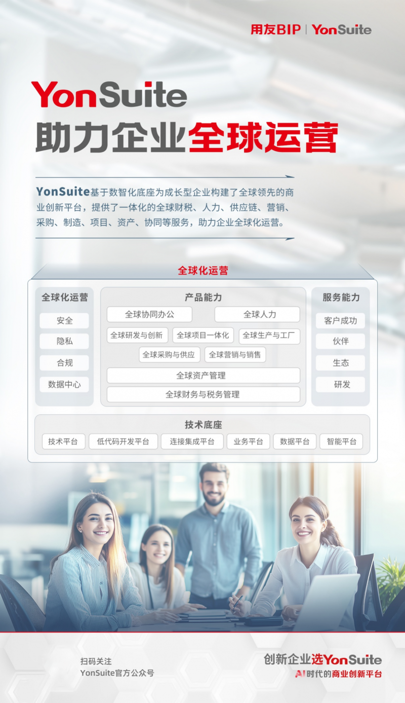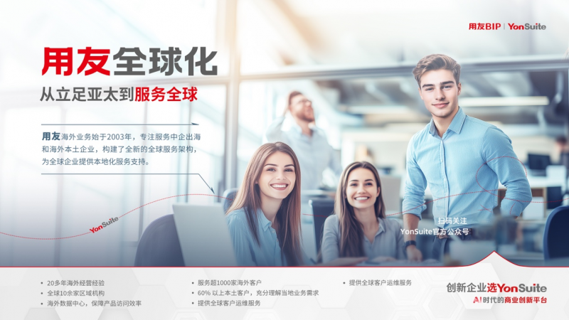 作為中國企業(yè)數(shù)智化轉(zhuǎn)型的先行者,用友始終站在全球化浪潮的前沿。通過持續(xù)創(chuàng)新和全球化布局,構(gòu)建了以用友YonSuite和用友BIP為核心的全球化產(chǎn)品矩陣,為全球企業(yè)提供了全生命周期、全階段的數(shù)智化轉(zhuǎn)型陪伴式成長服務(wù)。