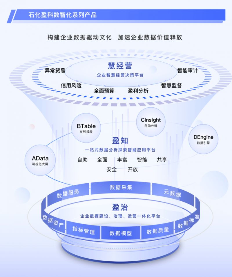 在數(shù)據(jù)業(yè)務(wù)領(lǐng)域,石化盈科以“構(gòu)建企業(yè)數(shù)據(jù)驅(qū)動(dòng)文化,加速企業(yè)數(shù)據(jù)價(jià)值釋放”為核心理念,打造全面、專業(yè)、智能的數(shù)據(jù)治理、數(shù)據(jù)分析、數(shù)據(jù)應(yīng)用產(chǎn)品體系,為客戶提供高效、全面的數(shù)字化服務(wù)與解決方案,推出“盈治”“盈知”“慧經(jīng)營(yíng)”等一系列數(shù)智化產(chǎn)品,助力中國(guó)石油、中國(guó)華能、中國(guó)船舶等多家大型央國(guó)企及新鳳鳴、康養(yǎng)集團(tuán)等行業(yè)標(biāo)桿企業(yè)在數(shù)智化轉(zhuǎn)型的浪潮中勇立潮頭。