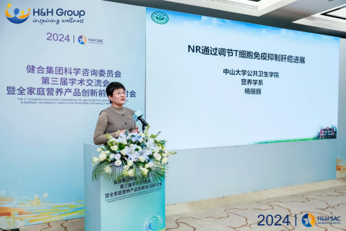 中山大學(xué)公共衛(wèi)生學(xué)院營養(yǎng)學(xué)系主任楊麗麗教授圍繞《NR通過調(diào)節(jié)T細(xì)胞免疫抑制肝癌進(jìn)展》研討話題,強(qiáng)調(diào)了NR等營養(yǎng)因素對未來人體健康防治產(chǎn)生的重要科研引領(lǐng)作用。
