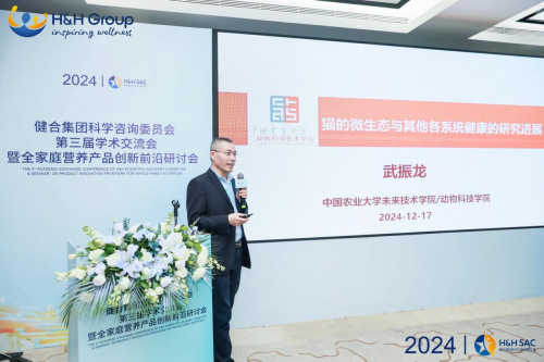 中國農(nóng)業(yè)大學(xué)動物科學(xué)技術(shù)學(xué)院武振龍教授則分享了《貓的微生態(tài)與其他各系統(tǒng)健康的相關(guān)研究進(jìn)展》研討話題,不僅介紹了腸道益生菌在功能性寵物食品中的應(yīng)用,還提出了貓的腸道微生物可能成為提高動物健康新靶點(diǎn)的見解,為寵物益生菌應(yīng)用提供科學(xué)新方向。