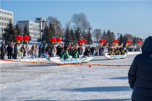 冬日的湯旺河畔披上了節(jié)日的盛裝,寬闊的湯旺河河面上,彩旗迎風(fēng)招展,五顏六色的氣球在空中飄舞著?;顒訄龅啬缃吁?、人聲鼎沸、鑼鼓喧天、樂曲聲聲,大秧歌、龍獅舞、鼓震興安等節(jié)目輪番上演,引來數(shù)千名群眾駐足觀看,精彩的熱身活動讓人們目不暇接?;顒又校€進行了冰上速滑、雪圈、雪地足球等冰雪體驗活動。