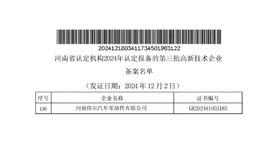 近日,河南倬爾汽車零部件有限公司成功獲評“高新技術(shù)企業(yè)”,證書編號為GR202441003185。這一榮譽(yù)不僅體現(xiàn)了企業(yè)在技術(shù)創(chuàng)新和科研實力方面的深厚積累,也標(biāo)志著公司正式邁入國家重點支持的科技型企業(yè)行列,將為其高質(zhì)量發(fā)展注入強(qiáng)勁動力。