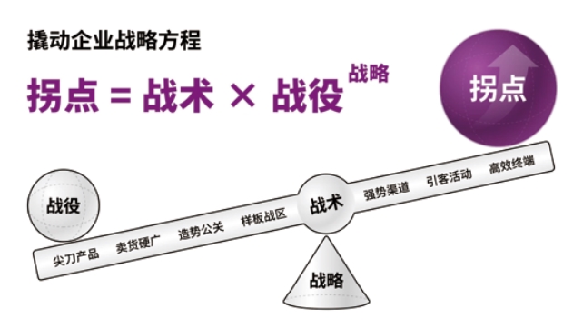 該方程包含四個(gè)核心要素:拐點(diǎn)、戰(zhàn)術(shù)、戰(zhàn)役和戰(zhàn)略,通過這四個(gè)要素的相互作用,幫助企業(yè)找到實(shí)現(xiàn)增長(zhǎng)的關(guān)鍵路徑。拐點(diǎn)是“戰(zhàn)術(shù)”與“戰(zhàn)役的戰(zhàn)略次方”的乘積,戰(zhàn)術(shù)、戰(zhàn)役、戰(zhàn)略這三因子中任一因子的變動(dòng)都會(huì)對(duì)拐點(diǎn)造成直接影響。