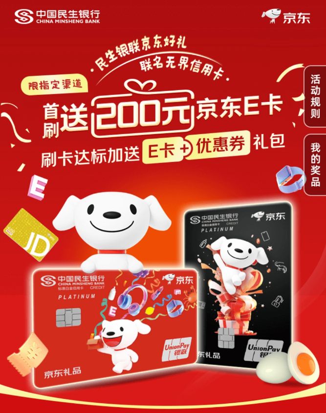 此次發(fā)行的民生京東好禮卡將主打“好禮”概念,在為用戶提供便捷支付體驗(yàn)的同時(shí),通過(guò)設(shè)計(jì)豐富的權(quán)益與優(yōu)惠活動(dòng),實(shí)現(xiàn)開卡即“回本”。該聯(lián)名卡不僅具備銀聯(lián)品牌標(biāo)準(zhǔn)白金級(jí)信用卡的各項(xiàng)尊貴權(quán)益,更為客戶精心定制了一系列與京東緊密關(guān)聯(lián)的專屬優(yōu)惠福利,具有“首刷禮”、“周周禮”、“月月禮”等諸多亮點(diǎn)權(quán)益。