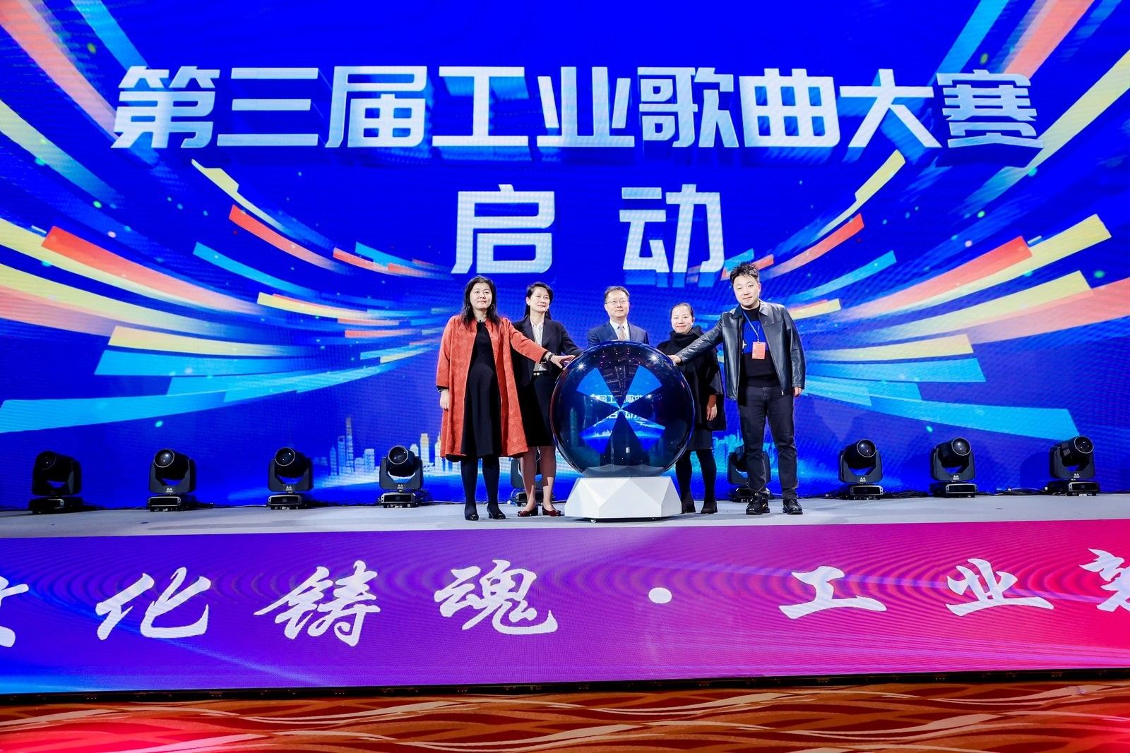 大會現(xiàn)場,一段令人激昂的開幕視頻播放完畢后,工業(yè)和信息化部工業(yè)文化發(fā)展中心副主任孫星,馬欄山創(chuàng)業(yè)投資有限公司副總經(jīng)理、馬欄山視聽節(jié)目國際版權交易中心總監(jiān) 李青穗,小芒電商粉絲圈層中心負責人李金龍,中華全國總工會文工團職工文藝處處長、國家一級演員楊竹青,中國東方演藝集團副總經(jīng)理張蕾,共同上臺啟動第三屆全國工業(yè)歌曲大賽。