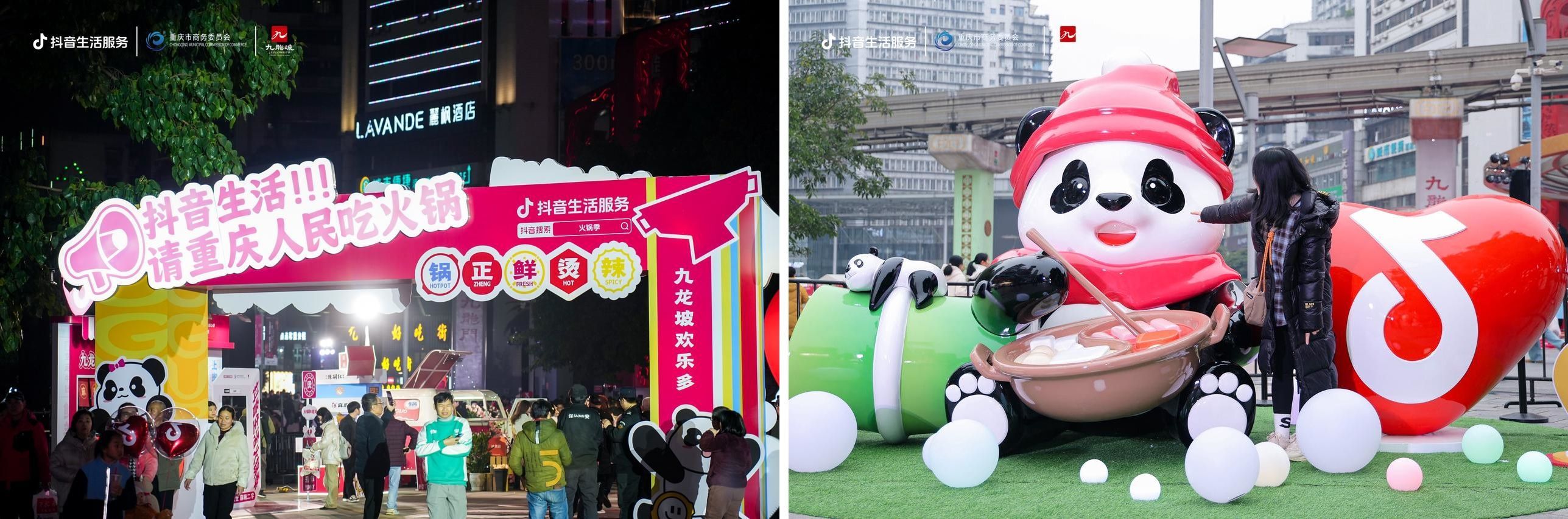 在火鍋宴環(huán)節(jié),抖音生活服務(wù)以“輕軌穿過巨型火鍋裝置”為視覺亮點(diǎn),呼應(yīng)重慶“輕軌穿樓”的奇觀,并融入如熊貓等川渝特色元素,為參與活動(dòng)的譚三娘、劉一手、鹵校長(zhǎng)、喜巴蜀、渝廚、張崇會(huì)等商家,“定制”了煙火氣十足的消費(fèi)場(chǎng)景。
