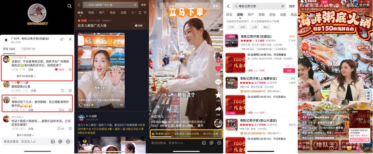 粵陳記煲仔粥本就擁有不俗口碑,他們選擇請(qǐng)出用戶老熟人——擁有400多萬平臺(tái)粉絲的演員@應(yīng)采兒,來提升用戶的品牌感知。在應(yīng)采兒的鏡頭下,種類繁多的鮮活水產(chǎn)、碼放整齊的各色肉類、現(xiàn)搓的“四打天王”等招牌菜都顯得格外誘人。而幫下菜品等周到服務(wù)的展現(xiàn),也讓用戶看到商家的品質(zhì),直接對(duì)品牌的好感度直線up。聞?dòng)嵍鴣淼木W(wǎng)友在評(píng)論區(qū)“團(tuán)建”,分享滿意的用餐體驗(yàn)。討論熱度飆升,直接帶動(dòng)話題#廣東的清湯火鍋也太好吃了 登上全國(guó)種草榜TOP5,#應(yīng)采兒解鎖廣式火鍋 登上同城TOP3,為商家?guī)硪淮蟛ǜ咿D(zhuǎn)化的流量,商家搜索上漲89%,達(dá)到品牌年度峰值,由此帶來的GMV更是達(dá)到70萬。