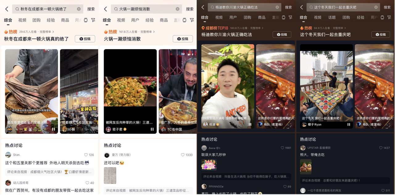 【抖音生活火鍋季】還打造了#秋冬在成都來一頓火鍋絕了、#火鍋一涮煩惱消散、#楊迪教你川渝火鍋正確吃法、#這個(gè)冬天我們一起去重慶吧 多個(gè)火鍋話題熱點(diǎn),持續(xù)引爆活動(dòng)氛圍,累計(jì)收獲1.1億曝光,話題下的短視頻內(nèi)容更是給商家?guī)?29萬的GMV增長(zhǎng)。