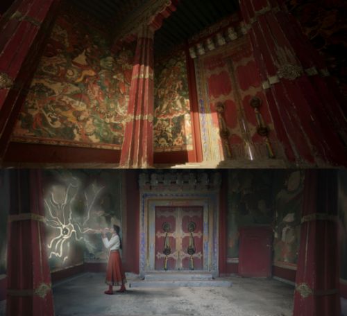 戴上VR設(shè)備浸入影展,布達(dá)拉宮躍然眼前,每一處建筑細(xì)節(jié)都栩栩如生。在科技的幫助下,觀眾能夠自由“游走”于四大天王殿、德央夏、紅宮回廊、西大殿、彌勒佛殿等代表性場(chǎng)景之中,華美的宮殿、絢麗的壁畫(huà)、精妙的雕像一一映入眼簾,珍寶文物應(yīng)接不暇,一磚一瓦、一筆一畫(huà)都如此生動(dòng)鮮活,訴說(shuō)著千年布宮的文化與歷史,腳下的石板路仿佛真實(shí)可觸,身處藏北草原、扎達(dá)土林、貢嘎冰川、巴松措等雪域高原的壯美景色,與之對(duì)應(yīng)的是西藏五色文化及寓意,讓人不由自主地沉浸其中,忘卻了現(xiàn)實(shí)與虛擬的界限,沉浸式探索神秘莊嚴(yán)的雪域高原文明密碼。
