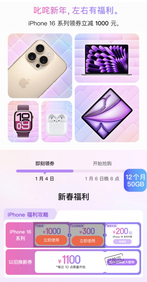 iPad、Apple Watch、AirPods等也有專屬優(yōu)惠。其中,iPad Air eSIM版領(lǐng)券至高優(yōu)惠千元;iPad 10代疊加消費(fèi)券至高優(yōu)惠1050元,256G WLAN版到手只需3049元;iPad mini eSIM版領(lǐng)券立減1000元,還加贈(zèng)300G流量包。Apple Watch S10領(lǐng)券立減560元,到手價(jià)低至2439元;Apple Watch S9可領(lǐng)100元以舊換新券,到手低至2099元。湖北用戶購買AirPods系列,使用國家貼下單立減20%,到手更劃算。AirPods Pro(第二代)限量直降200元,到手價(jià)低至1699元;AirPods Max(USB-C)限量直降300元,到手價(jià)3699元;日常價(jià)149元的Apple原裝20W充電器到手價(jià)降至90元。此外還有Apple Store充值卡至高優(yōu)惠10%,iCloud+領(lǐng)券立減6元,PLUS會(huì)員購買AppleCare+全線產(chǎn)品可享9折優(yōu)惠,至高省150元等福利。