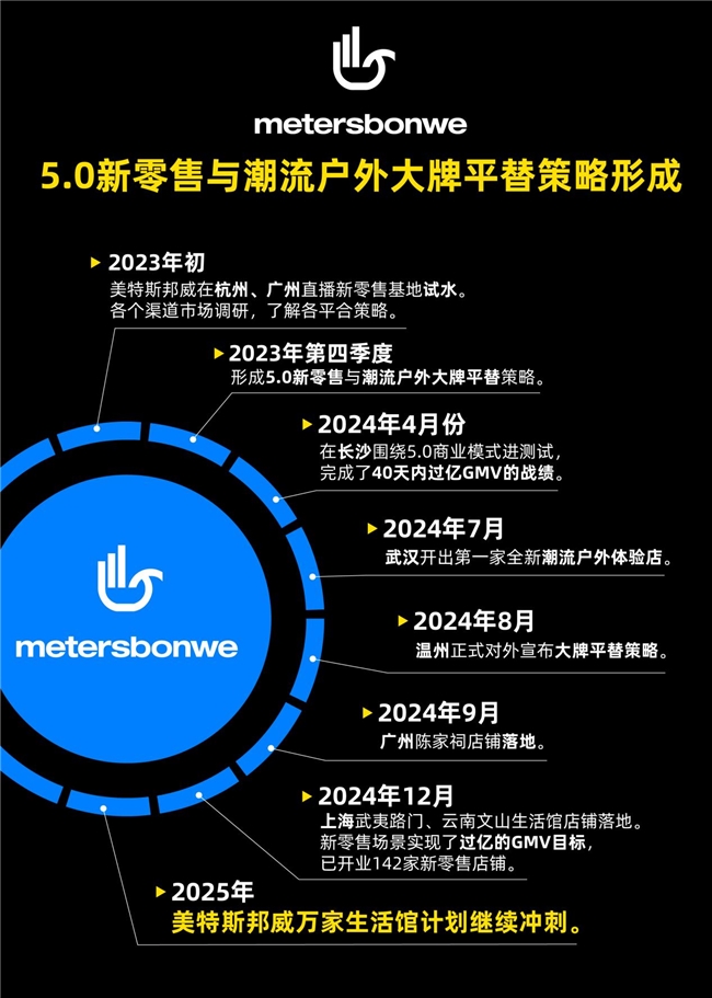 2023年,試水杭州、廣州直播新零售基地,通過線上線下深入調(diào)研,摸清平臺玩法;2023年第四季度,經(jīng)過反復(fù)論證后形成“5.0新零售”與潮流戶外“大牌平替”策略,以全域O2O模式建立品牌打法。