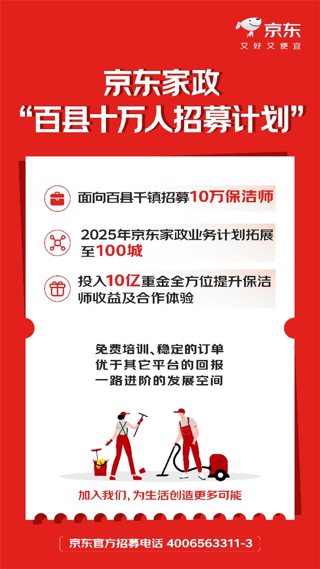 歲末正值家政需求旺季,據(jù)央視新聞報道,很多家庭都在預(yù)約深度保潔服務(wù),京東家政收到的保潔訂單劇增,現(xiàn)有人手供不應(yīng)求。為滿足連年增長的家政服務(wù)需求,推動高質(zhì)量就業(yè),1月7日,京東家政開啟“百縣十萬人招募計劃”,面向百縣千鎮(zhèn)招募10萬保潔師。2025年京東家政業(yè)務(wù)計劃拓展至100個城市,并投入10億資金全方位提升保潔師收益及合作體驗(yàn)。