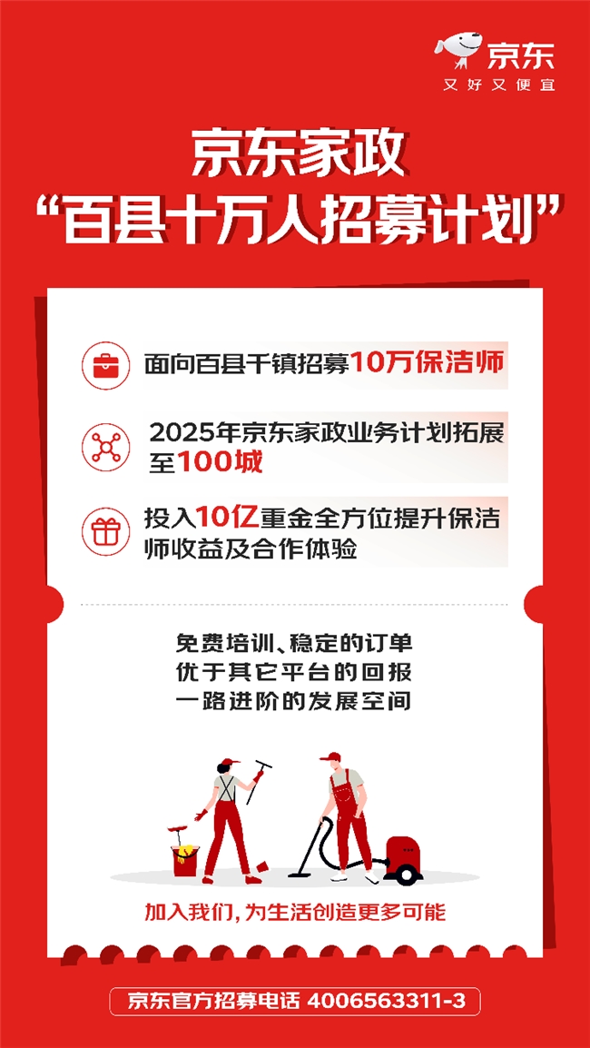 近期京東憑借一連串漲薪舉措,成為備受網(wǎng)友羨慕的“別人家的公司”。繼公布2024年年終獎(jiǎng)發(fā)放計(jì)劃和超2萬名京東客服漲薪通知后,京東又帶來重磅好消息:1月7日,京東家政開啟“百縣十萬人招募計(jì)劃”,面向百縣千鎮(zhèn)招募10萬保潔師。2025年京東家政業(yè)務(wù)計(jì)劃拓展至100個(gè)城市,并投入10億資金全方位提升保潔師收益及合作體驗(yàn)。