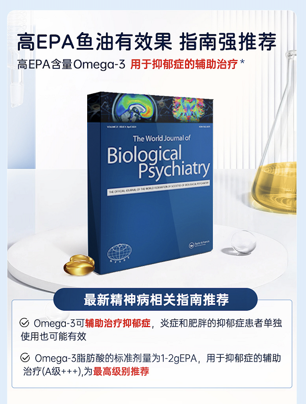 《2022世界生物精神病學會聯合會/加拿大情緒和焦慮治療網絡臨床指南:應用營養(yǎng)藥物和植物制劑治療精神疾病》中將每日攝入1-2克的EPA作為抑郁癥治療的輔助手段?!?019國際營養(yǎng)精神病學研究學會實踐指南》指出,高EPA魚油可以用于孕婦、兒童和老年人的重度抑郁癥治療以及高危人群的預防,純EPA或EPA/DHA>2:1的抑郁緩解表現相對較好。