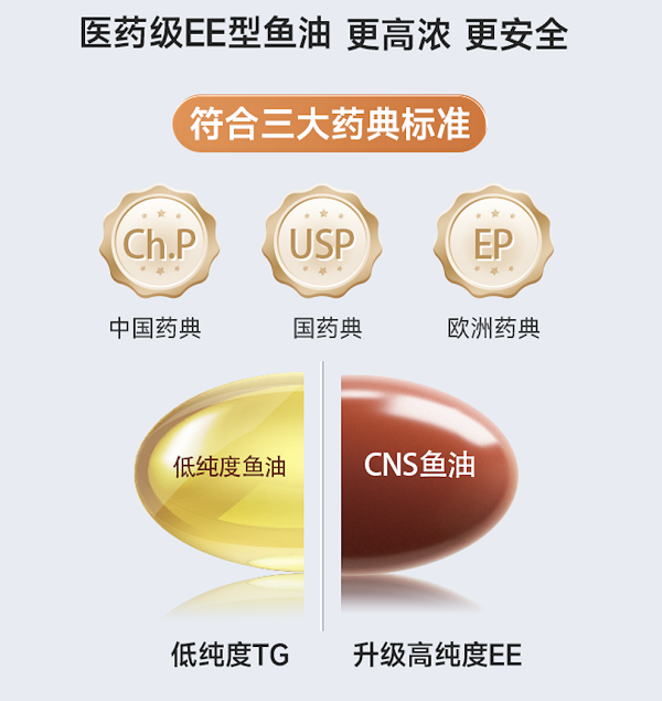 基于科學循證的指導,CNS情緒魚油在Omega-3純度上達到了97%,EPA含量高達90%,且EPA與DHA的比例大于2:1,符合美國醫(yī)用級別的標準,能夠科學滿足抑郁障礙人群每日的情緒健康營養(yǎng)需求。
