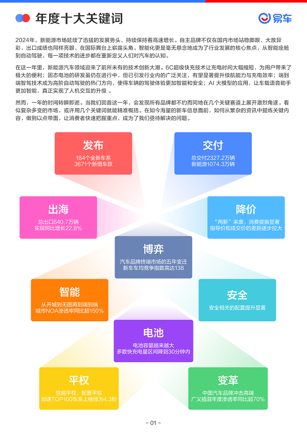 1月24日,易車發(fā)布《2024年中國乘用車市場洞察報告》(以下簡稱“報告”),洞察2024汽車市場趨勢,結(jié)合易車榜各維度榜單數(shù)據(jù)、易車汽車數(shù)據(jù)庫等,透過十大年度關鍵詞,為汽車市場下一步的走向提供有益參考。