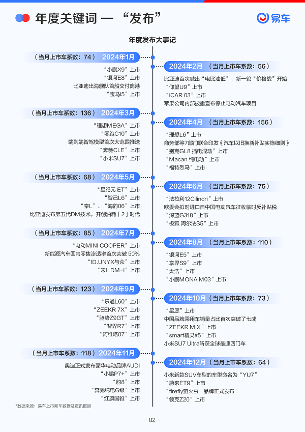 報告盤點了在2024年新車發(fā)布的年度大事記。2024年,共計920個各類別車系更新上市,其中全新車系184個,占當年新車的20%,新車數(shù)量持續(xù)攀升。