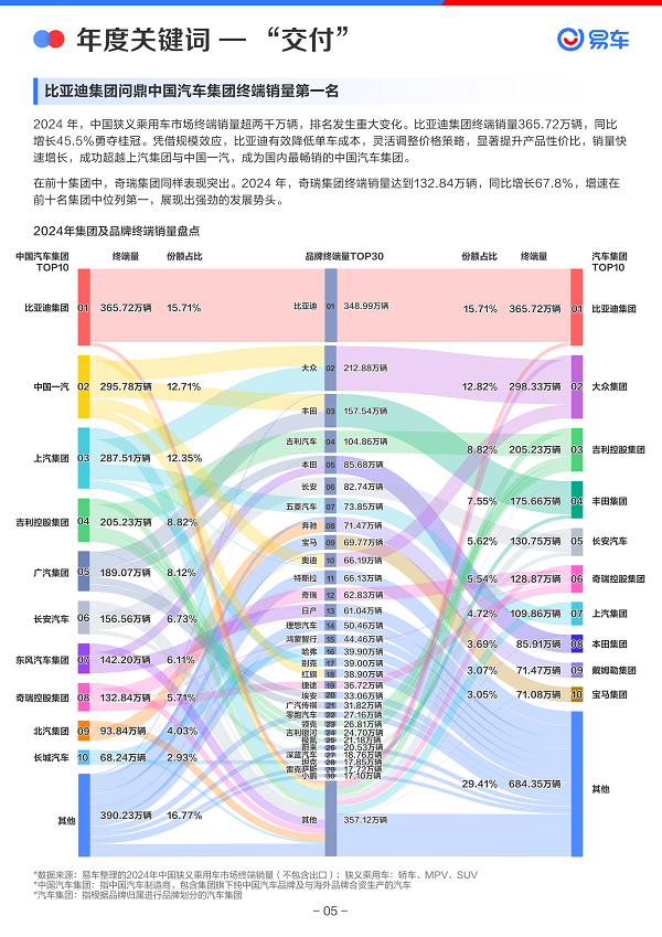2024 年,中國狹義乘用車市場終端銷量超兩千萬輛。比亞迪集團終端銷量365.72萬輛,同比增長45.5%勇奪桂冠。此外,2024 年奇瑞集團終端銷量達到132.84萬輛,同比增長67.8%,增速在前十名集團中位列第一。