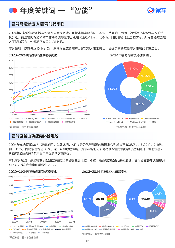 2024年車內(nèi)娛樂功能、高精地圖、車載冰箱、AR實景導航等配置的滲透率同比增速均超50%。車機芯片領域,高通驍龍8155依然在市場中占據(jù)主流地位。